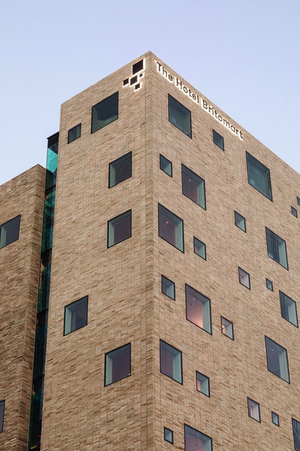This approach is also evident in the building’s exterior. The Hotel Britomart is a pair of thin towers made entirely from brick. The brick is rough, small and irregular and perforated with what Nat calls “a constellation of windows that are as precise and flat as iPhone screens.”